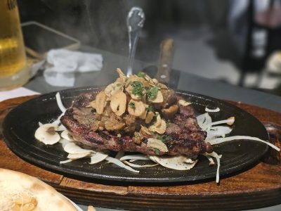 특별 레시피로 조리한 마늘이 듬뿍 올라간 매드포갈릭의 시그니처 등심 스테이크.