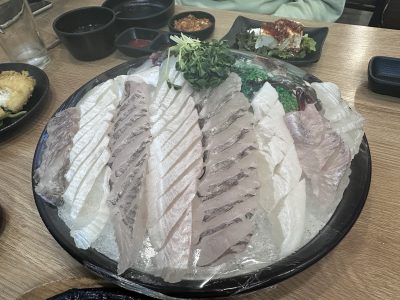 4인이 가서 광어+우럭(대) 단품을 시키니 석화와 멍게가 4인용 애피타이저로 나와서 일단 소맥 한잔 말아먹음. 이후 미역국, 생선구이, 초밥, 버섯구이, 두부 등이 밑반찬으로 나왔다. 회 나오기 전부터 술이 술술 들어감.