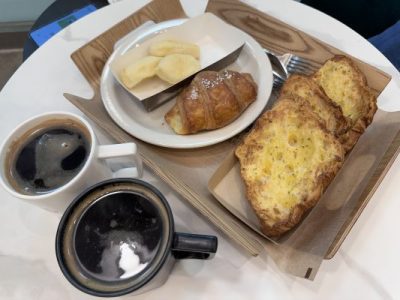 페스츄리를 반으로 잘라 갈릭버터를 발라놓은 갈릭러스크 메뉴와, 치즈롤 같은 치즈퐁듀 빵, 그리고 소금빵 이렇게 세 개를 시켰는데.. 이후에 아이를 위한 초코크로아상도 추가했다.