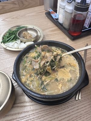 한 상 차려지면 부추를 국밥 안에 팍팍 집어넣고 먹는다. 생양파를 좋아하지 않아 양파 안 먹으려 했으나 먹으니 맵지 않아 다 먹었음. 부추 나오는 접시에 부추, 고추, 양파, 된장이 같이 나온다.