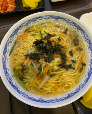 메뉴는 다양한데, 잔치국수를 처음 먹어보고는 맛있어서 지금까지는 잔치국수만 먹었다. 사람이 많지 않으면 조금 밀릴수도 있겠지만, 사람이 별로 없다면 주문한 직후 얼마 지나지 않아 바로 나왔다. 뜨끈뜨끈한 국물에 소면과 야채가 고명으로 올라가있다. 특별할 것 없는 잔치국수인데 내 입맛에 딱 맞았다. 음식 받는 곳 왼편에 보면 양념장이 있어서 매콤하게 먹고 싶다면 따로 가져올 수 있다.